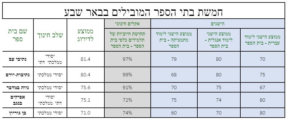 הבדיקה שערכו בסטארטאפ RealX מגלה כי חמשת בתי הספר היסודיים הטובים ביותר בבאר שבע הם: נתיבי עם, נתיבות – יורם, נווה במדבר, אפיקים בנגב ובן גוריון. מהבדיקה עלה כי ממוצע ההישגים בלימודי העברית נע בין 67-80, ממוצע ההישגים בלימודי אנגלית נע בין 74-80 וממוצע הישגי הלימוד במתמטיקה נע בין 60-79. בנוסף לכך האקלים החינוכי כלומר, תחושת הסיפוק של התלמידים מבית הספר נע בין 72%-97% כאשר בית הספר המוביל בקטגוריה זו הוא נתיבי עם.