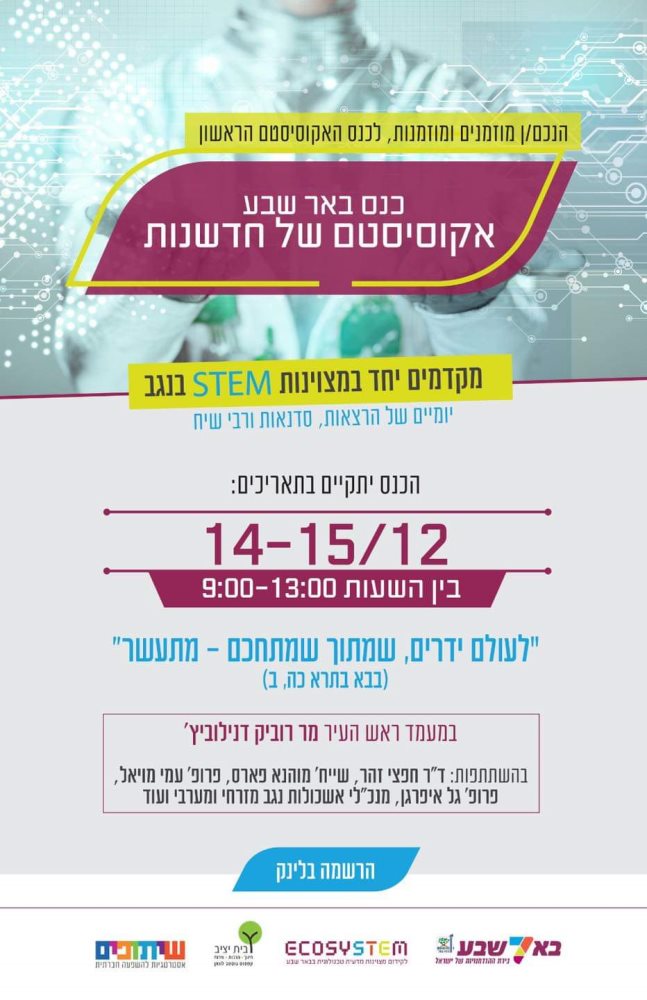 כנס האקוסיסטם הראשון בבאר שבע יערך בין התאריכים 15/12/20-14/12/2ב-zoom ויאפשר הזדמנות להכיר לעומק תהליכים ותפיסות חדשניות לגבי הנעשה בתחומי ה- stem (מדעים, הנדסה וטכנולוגיה) בבאר שבע בפרט ובנגב בכלל