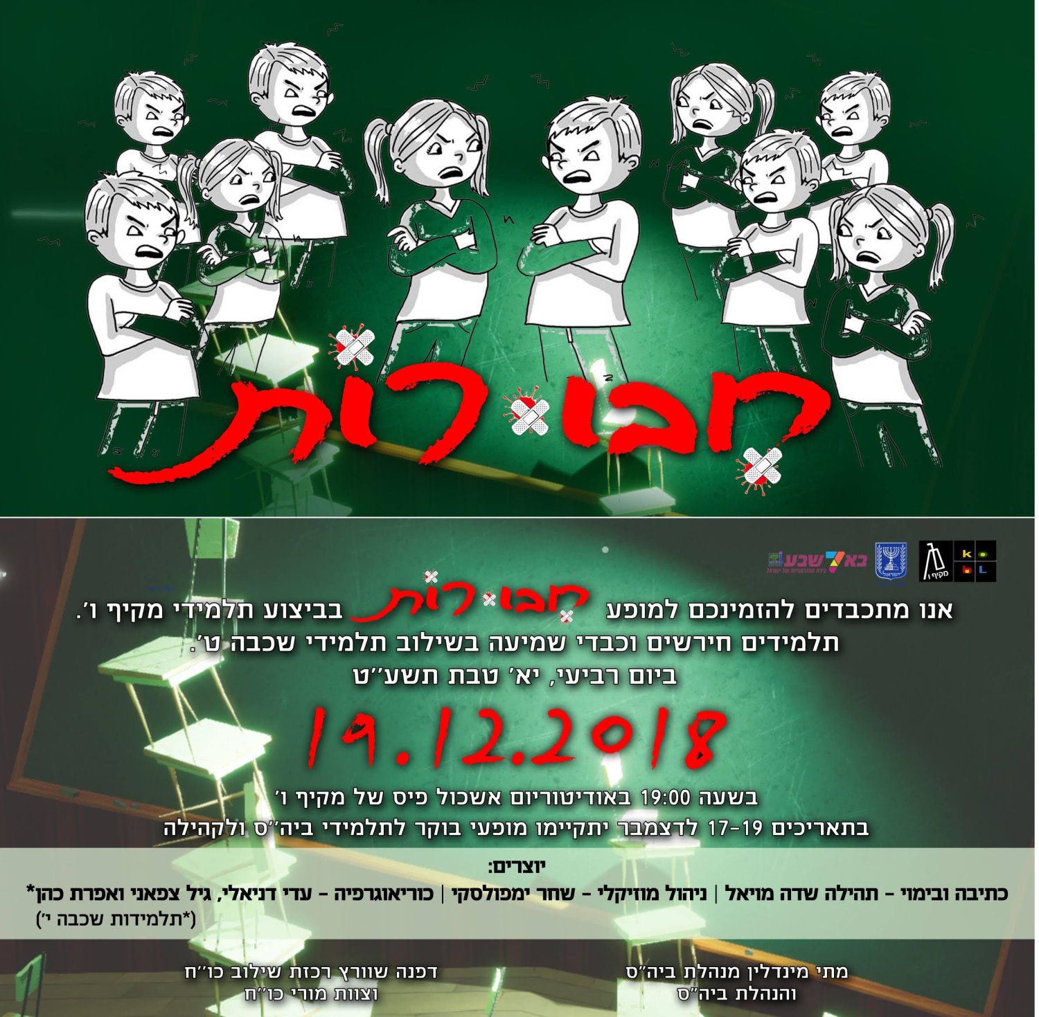 אז הינה חודש דצמבר הגיע וכמו בכל שנה בחודש זה עולה הצגה חדשה. השנה ההצגה מספרת את סיפורה של ילדה שומעת, אשר מנסה להתקבל לחבורת נוער שלומדת איתה בבית הספר. היא נתקלת בקשיים מאחר וכל חברי החבורה אליה היא מנסה להצטרף חירשים. לכן, היא מוצאת עצמה בניסיונות חוזרים להתקבל לחבורה, כאשר לא כל חברי החבורה רואים בה אחת מהם ולא מסכימים פה אחד האם לקבל אותה או לא. אז איך לדעתכם תתמודד הילדה השומעת עם הניסיונות להיכנס לחבורה? והאם כל החבורה תצליח להגיע להסכמה? כדי לקבל את התשובות לכל השאלות הללו תצרכו להמתין ולשמוע בהצגה שמתקיימת השבוע: ביום רביעי ה-19.12.18, בשעה: 19:00, באודיטוריום אשכול פיס של מקיף ו'.