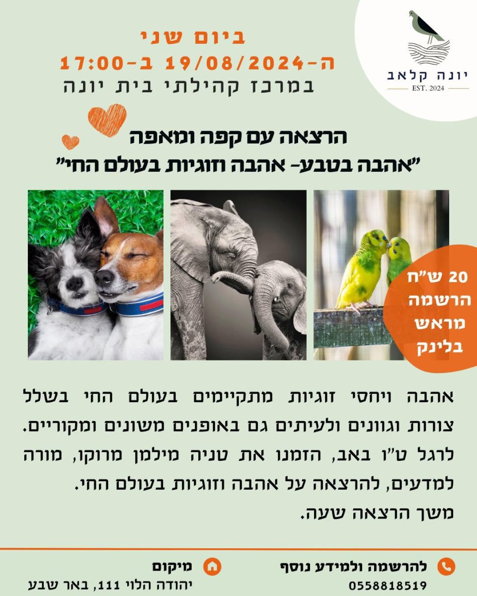 17:00- לכבוד ט״ו באב הרצאה עם קפה ומאפה ביונה קלאב בנושא ”אהבה בטבע- אהבה וזוגיות בעולם החי“ עם טניה מילמן מרוקו, מורה למדעים.