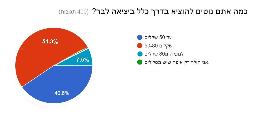40.6% מהסטודנטים ענו כי הם מוציאים עד 50 שקלים ליציאה, ולעומתם היה רוב של 51.2% שענו כי הם מוציאים בין 50-80 שקלים לכל ישיבה בבר. 7.5% מהסטודנטים ענו כי הם נוטים להוציא יותר מ-80 שקלים ו-0.5% בודדים ענו כי הם הולכים לברים המציעים מסלולי שתייה כדי לשתות לשוכרה.