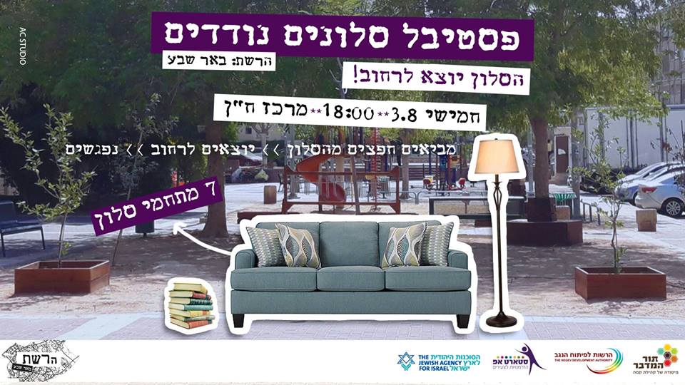 ממש בעוד יומיים, ביום חמישי הקרוב, ה-03/08, קבוצת "הרשת: באר שבע" מזמינה אתכם להגיע לפסטיבל סלונים נודדים וקוראת למשתתפים להוציא את הסלון לרחוב! מה זה אומר? קונספט סלונים מיוחד- כולם יחד מביאים חפצים מהבית- מנורה, שטיח, כורסא וכדומה, יוצרים "סלון" ברחוב ומצטרפים לסלון האהוב והמעניין לנו.