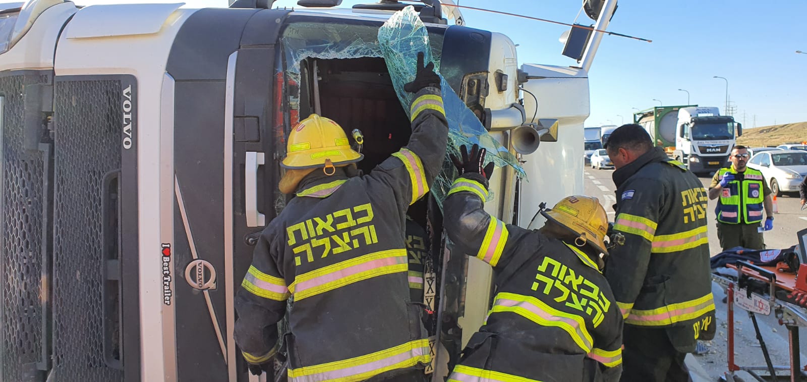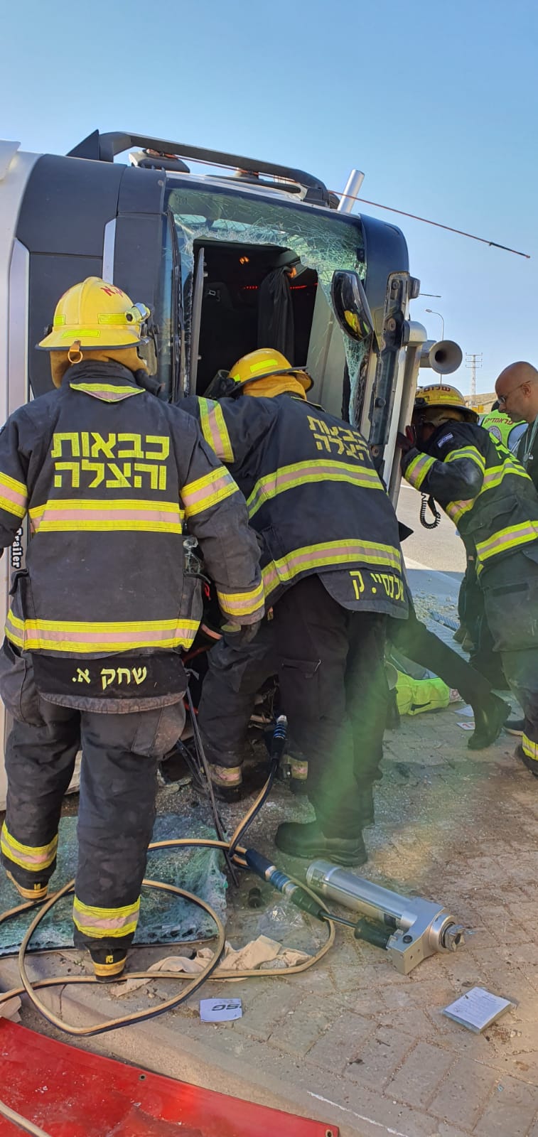 פראמדיק מד"א שי קדוש סיפר: "כשהגענו למקום ראינו את נהג המשאית לכוד במשאית שהתהפכה על צידה כשהוא בהכרה וסובל מפגיעה רב מערכתית. תוך כדי פעולות החילוץ המורכבות והממושכות של הכיבוי הענקנו לו טיפול רפואי שכלל מתן תרופות וקיבועים. לאחר שהוא חולץ הכנסנו אותו לניידת טיפול נמרץ והמשכנו בטיפול הרפואי מציל החיים שכלל הרדמה והנשמה ופינינו אותו לבית החולים כשמצבו קשה".