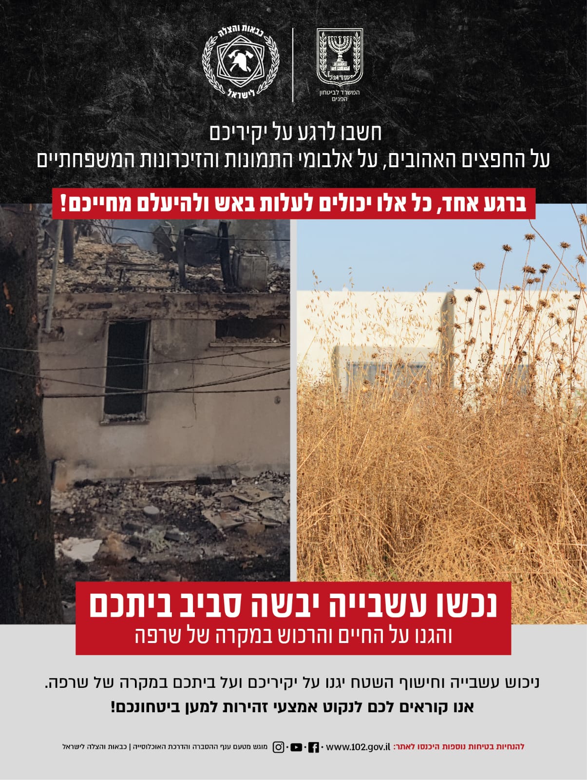 אנו מזכירים לציבור לנקש את העשבייה מסביב למבנים, בתי קרקע, מחסנים וכו' בכדי למנוע את הסכנה הבאה. עדיף חשוף מאשר שרוף!