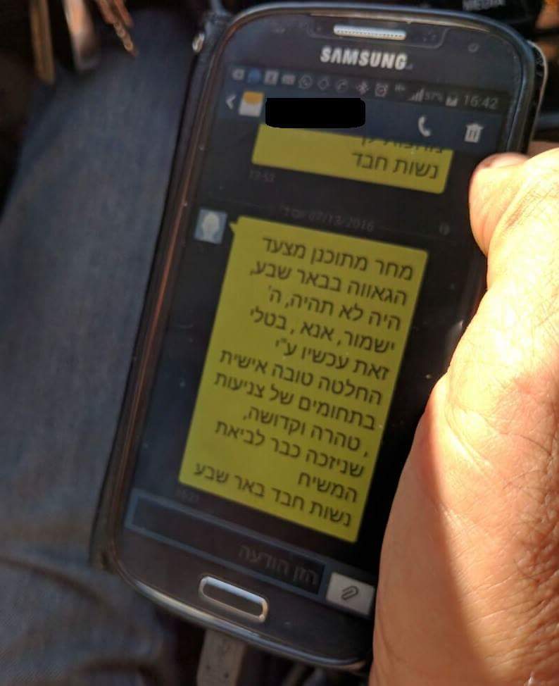 כמו כן, היום בשעות אחר הצהריים המאוחרות, החלו להתקבל מסרונים מנשות חב"ד בגנותו של המצעד, דרך קבוצות תפוצה שונות לפלאפונים אישיים של תושבי באר שבע. במסרון נכתב: "מחר מתוכנן מצעד הגאווה בבאר שבע, היה לא תהיה, ה' ישמור, אנא, בטלי זאת עכשיו ע"י החלטה טובה אישית בתחומים של צניעות, טהרה וקדושה, שנזכה כבר לביאת המשיח. נשות חב"ד באר שבע".