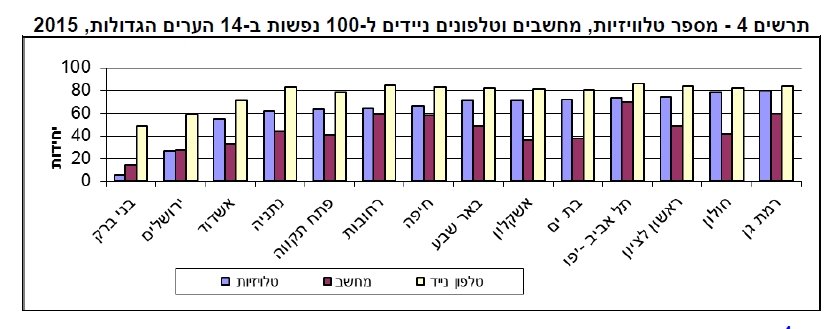 לבאר שבעים יש יותר טלוויזיות, בתל אביב קצת יותר מחוברים לאינטרנט