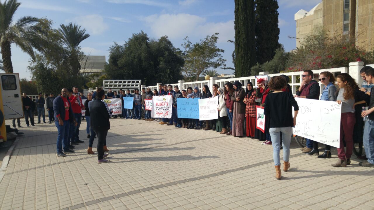 בהפגנה היום, שנערכה כשעה, השתתפו למעלה מ-50 פעילים ופעילות. אותה הפגנה בדיוק התרחשה באותם רגעים גם באוניברסיטאות אחרות בארץ- אוניברסיטת תל אביב, האוניברסיטה העברית ואוניברסיטת חיפה, כשהסיסמא הראשית של המפגינים קוראת לאי הריסת בתים של ישובים בדואים בנגב ולהתנגדות לאלימות. ההפגנה התנהלה באופן מסודר וללא כל התפרעויות.