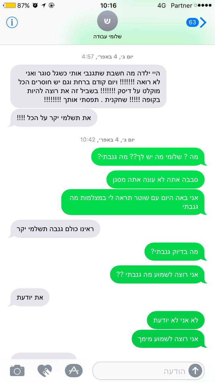 אלא שאז לטענתה המנהל שלומי דרש ממנה לעזוב את החנות "הוא כל הזמן מסתכל במצלמות. שהוא ראה שאני לא הולכת הוא הגיע, בא למשוך אותי מהחולצה ואמרתי לו 'שלא תעז לגעת בי'. אחר כך יצאתי והוא יצא אחרי והתחיל לצעוק עליי שגנבתי".