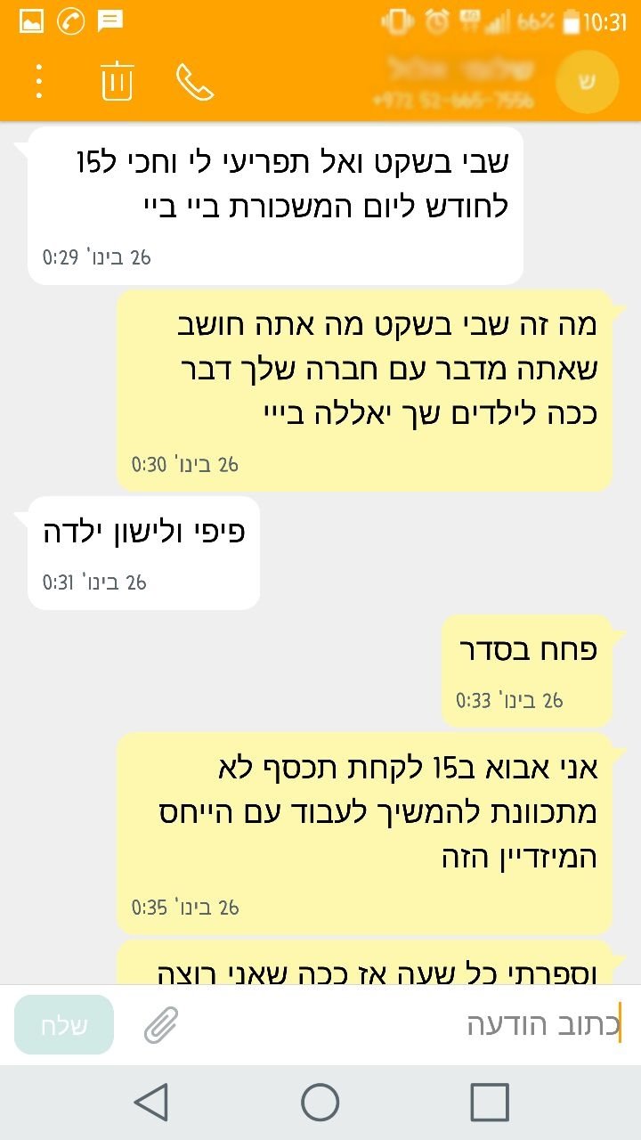 ד' הוסיפה כי "נותנים לנו את המשכורת ב-15 לחודש כל חודש ולא בעשירי, הביאו לי תלוש והייתי אמורה לקבל 1,104 שקלים, ואז הורידו לי 80 שקל על סיגריות. למה? שאלתי וגל אמר לי שחסרות שתי קופסאות של סיגריות. וגם הוריד על כסף למונית שנסעתי בה הביתה, לא מבינה על מה הוא מוריד לי כסף".