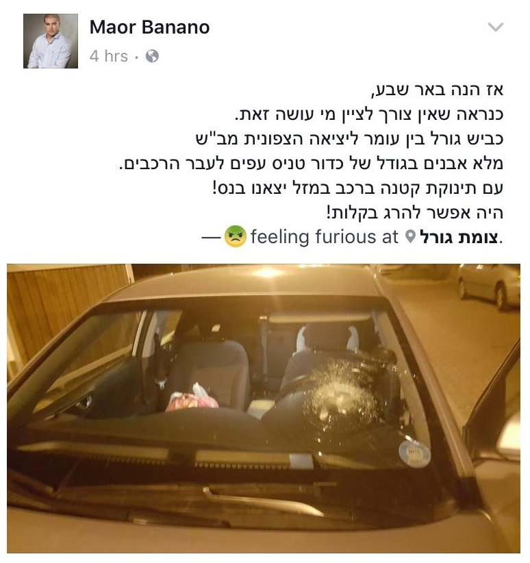 תושב מבועים, מאור בוננו שעובד בבאר שבע נסע אתמול (ראשון) בערב בכביש גורל בין באר שבע לעומר וחטף מטר אבנים על רכבו. השמשה הקדמית נופצה והפח ביונדאי נפגע. מאור נסע עם בתו התינוקת וציין כי היה להם הרבה מזל, ובקלות יכלו להיהרג אם היה מאבד שליטה על הרכב ועושה תאונה.