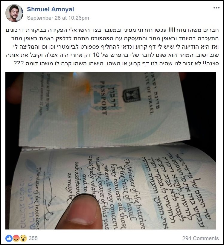 אל יהודית מצטרפים עוד עשרות ישראלים שטוענים כי דרכוניהם נקרעו לאחר שעברו בביקורת הגבולות, בנתב"ג או בטאבה, וכי התבקשו מהפקידים להחליף לדרכון ביומטרי. זאת, למרות שאינם זוכרים שדרכונם היו קרוע לפני כן. כל העניין החל בעקבות פוסט בפייסבוק שהתפרסם על ידי שמואל מויאל בקבוצה "אוהבי סיני", בו הוא מספר שהפקידה בביקורת הדרכונים בחנה את דרכונו ולאחר שהחזירה לו אותו, ציינה בפניו כי הוא קרוע ועליו להחליפו לדרכון ביומטרי. עוד הוא ציין כי חברו, שעבר גם הוא במעבר הגבול בטאבה, חווה את אותו המקרה. "איך שראיתי את הפוסט וראיתי כי הוא גם העלה את התמונה של הדרכון הקרוע, הבנתי שזה היה בדיוק אותו קרע שלי. הדרכון חדש, הוא לא בלוי ורק דף אחד קרוע, ואפילו לא קרוע בתפר, אלא הוא גזור. נדלקה לי נורה אדומה באותו רגע... את שומעת יותר מידי דברים לא הגיוניים", משתפת יהודית.