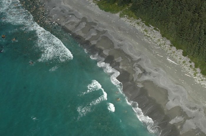 מפרץ אלסקה הצפוני מקושט בחול אפור, גזעי עצים מתים שנסחפו על הגלים וסלעים רבים. החול האפור נובע משחיקת הסלעים לחול אפור וגס.