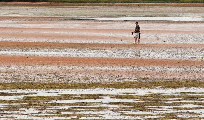 תמונה מופלאה זו, של החוף ליד מצר הים בשעת השפל, מציגה את החוף הצבוע בגווני ורוד, כתום וצהוב עמוק.