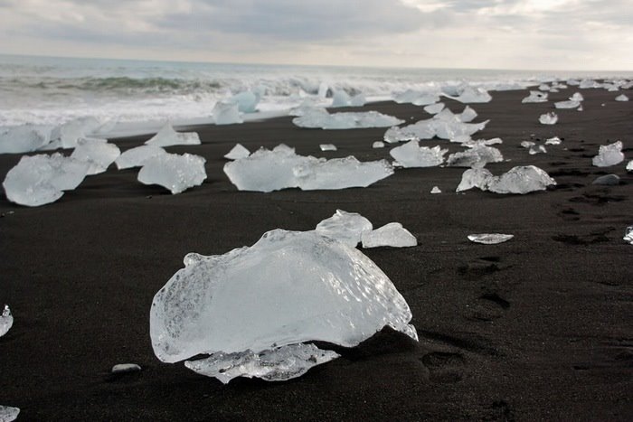 בתמונה נראים שברי קרחון שנסחפו אל החול השחור של החוף. ברוב המקומות בהם יש חול שחור, הצבע השחור נובע מהקרבה להרי געש. חלקיקי לבה זעירים מתקררים והופכים לגרגרי חול שחורים.