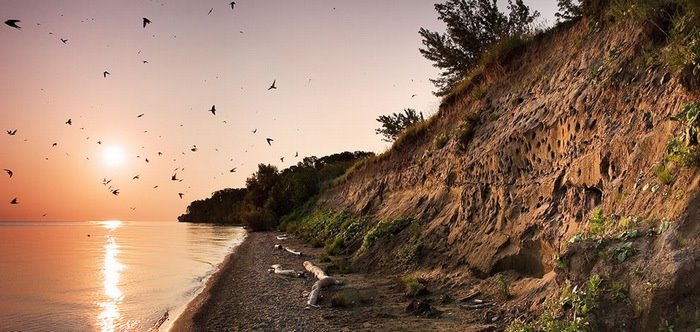 חוף צבוע בצבעי שוקולד כהים על גדת אגם אונטריו. המחילות בקיר הסלע הם קיניהם של זרזירים היוצרים מחזה מדהים במעופם עם רדת הערב.