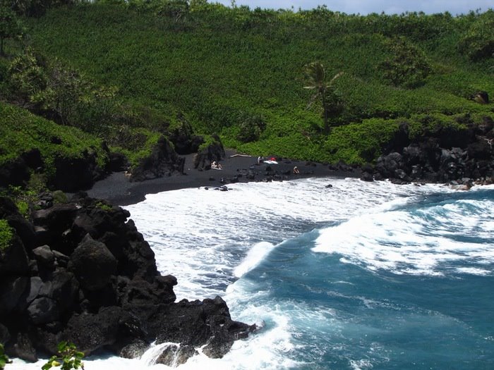החול השחור של חוף זה יוצר מראה ייחודי למדי, יחד עם היער הירוק והאוקיינוס הכחול. החול השחור נובע מפליטות געשיות הנפוצות באיי הוואי.
