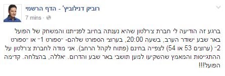 ראש העיר דנילוביץ' העלה סטטוס לפייסבוק בו הוא מכריז כי המשחק כן ישודר בטלוויזיה: "ברגע זה הודיעה לי חברת צ׳רלטון שהיא נענתה בחיוב לפנייתנו והמשחק של הפועל באר שבע ישודר הערב, בשעה 20:00, בערוצי הספורט שלהם- ״ספורט 1״ או ״ספורט 2״ (ערוצים 53 או 54) לצפייה בחינם (פתוח לקהל הרחב). אני מודה לחברת צ׳רלטון על ההתגייסות והמאמץ שהשקיעו למען תושבי באר שבע והדרום. יאללה, בהצלחה. קדימה הפועל!!!"