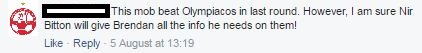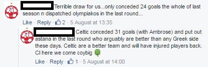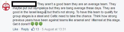 -הם לא קבוצה טובה, הם קבוצה ממוצעת. אולי ניצחו את אולימפיאקוס אבל לא חוכמה גדולה. הם טובים בליגה הישראלית אבל הליגה הישראלית חלשה. זה שהם הגיעו עד פה זו גניבה וסלטיק צריכה לנצל את ההזדמנות. תחשבו כמה חזקים היינו שנים קודמות מול ארסנל וווילה-ריאל בשלבים האלה..