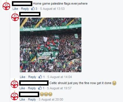 מעל הכל, מהדהדת תמיכתם של גרעין מאוהדי הקבוצה ברשות הפלסטינית. לא פעם דגלי אש"ף הונפו במשחקי סלטיק, ולפני כשנתיים אף נקנסו על כך מהנהלת אופ"א על כ-80 אלף שקלים. האוהדים ששמעו על המתחרה הישראלית, לא יכלו להתאפק ולהביע דעתם על כך.