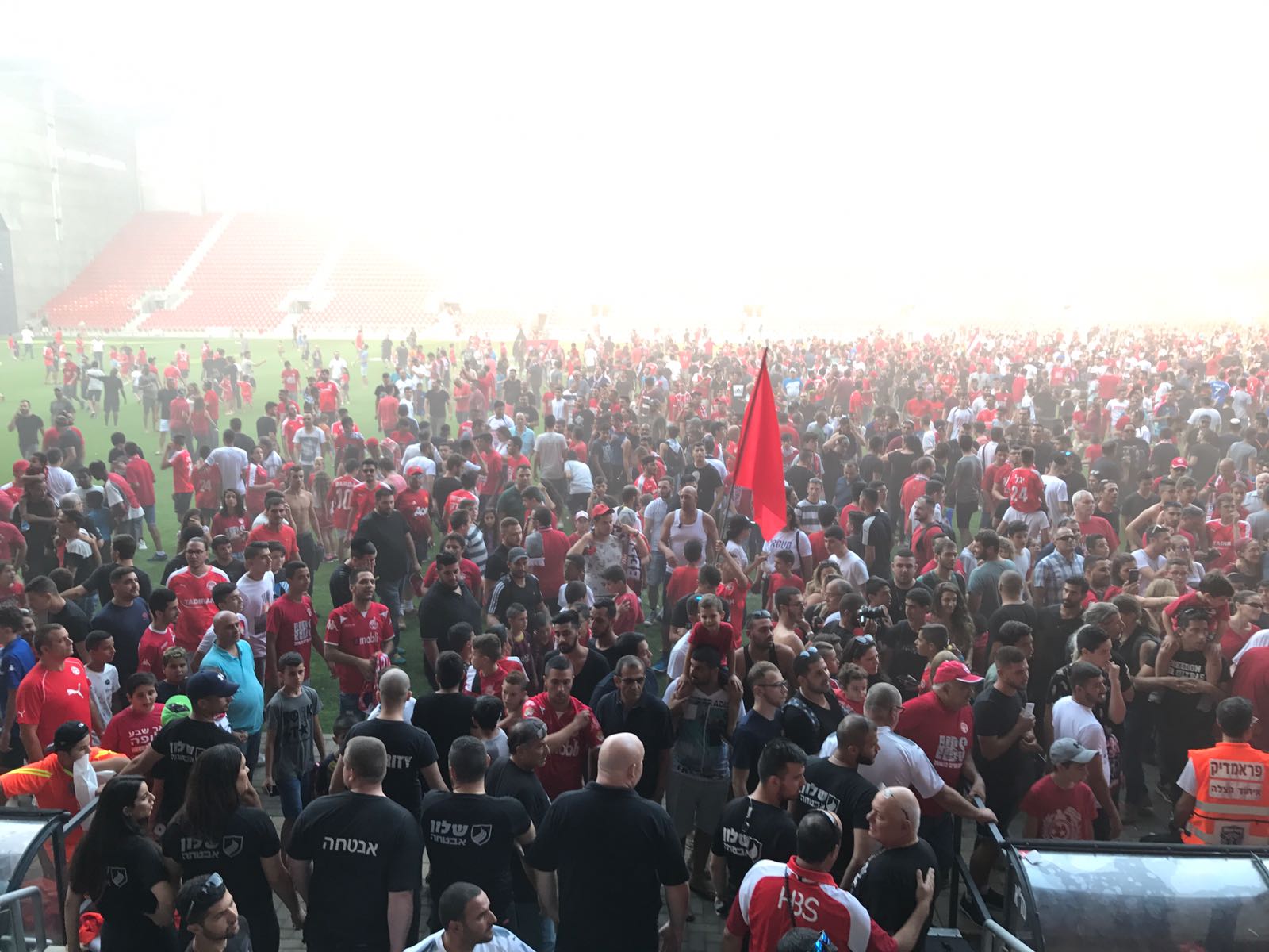 במועדון סברו כי האוהדים יכבדו את בקשתם לא לפרוץ לכר הדשא, אבל לא כך היה. השחקנים קיבלו הוראה שבמידה ותתרחש פריצה, הם צריכים לעשות את דרכם לחדר ההלבשה ולא לשתף פעולה עם האוהדים. כך הצליחו לעשות רוב השחקנים, אך מספר בודד "נתפס" בידי הקהל. המצב המבלבל גרם לכך שחלק מהשחקנים, כמו אורן ביטון, נכנסו למעיין "קטטה" עם המאבטחים, שרצו להכניס אותו לחדר ההלבשה, אבל הוא מצדו רצה להעניק אהבה ולהצטלם עם האוהדים.
