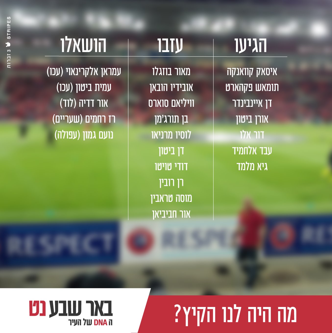 בתום העונה שעברה, 12 שחקנים היו מושאלים מהפועל באר שבע לקבוצות שונות. ניתוח של פעילות השחקנים הללו בקיץ מגלה נתון לא מעודד – רק ארבעה מהם ימשיכו העונה על תקן "מושאלים". שישה מהם שוחררו מהפועל באר שבע ללא תמורה, אחד מהם (דן ביטון) נמכר לקבוצה אחרת ואילו שחקן אחד בלבד (אמיר חלאילה, שעליו נפרט בהמשך) יהיה חלק מהסגל של הפועל באר שבע, לפחות עד ינואר 2018. אז היכן ישחקו השחקנים העונה?