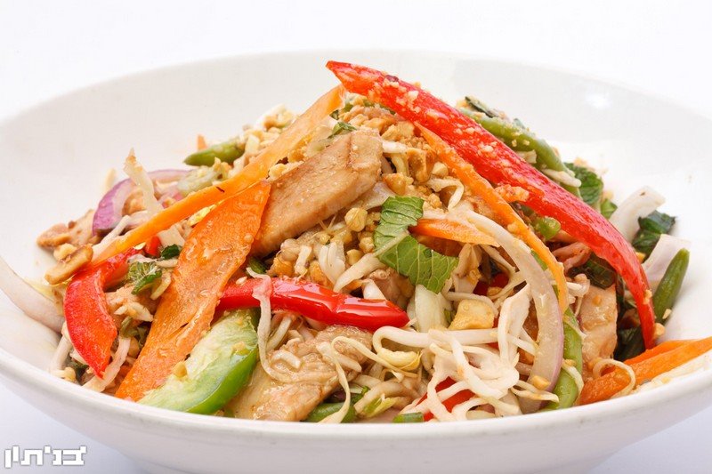 בצל ירוק,פטריות פרוסות,בצל סגול,כרוב חתוך דק,גזר שערות,שעועית ירוקה,נבטים סיניים,