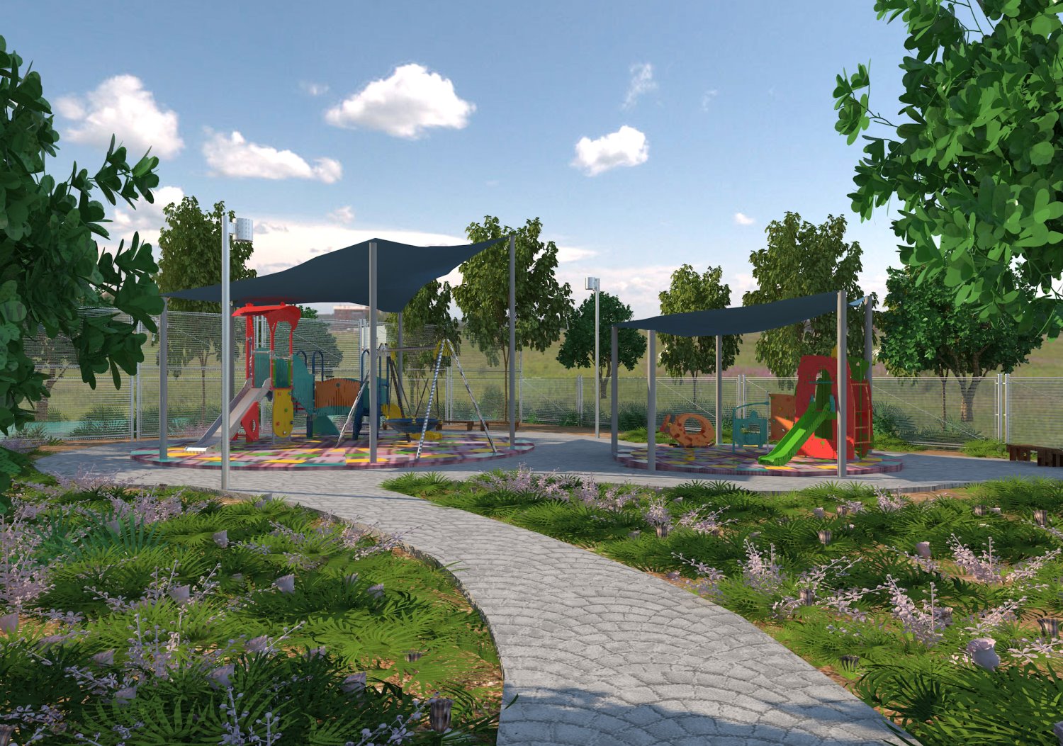במתחם הגן הממוקם בסמוך למגרש ספורט רב תכליתי מוקמים בין היתר: מתקני משחק מגוונים, פינות ישיבה והצללה, מדשאות, שבילי הליכה וכן מתבצעות עבודות פיתוח נופי.