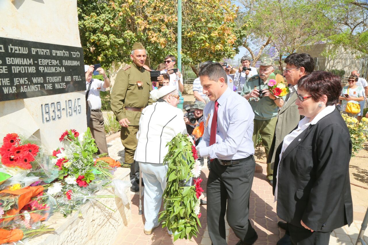 בטקס השתתפו בין היתר: ראש העיר רוביק דנילוביץ', סגנים וחברי מועצת העיר, מנהלת מרחב ב"ש והנגב במשרד העלייה והקליטה נטלי גרנד, יו"ר ועד ברית הווטרנים במחוז דרום לאוניד לויטן, סא"ל (במיל') יו"ר ארגון חיילים ופרטיזנים נכי המלחמה בנאצים בסניף ב"ש פרופ' ויטלי פולונוב, מזכיר איגוד החיילים המשוחררים בארץ אשר דישון, נציגי נוער ונציגי צה"ל.