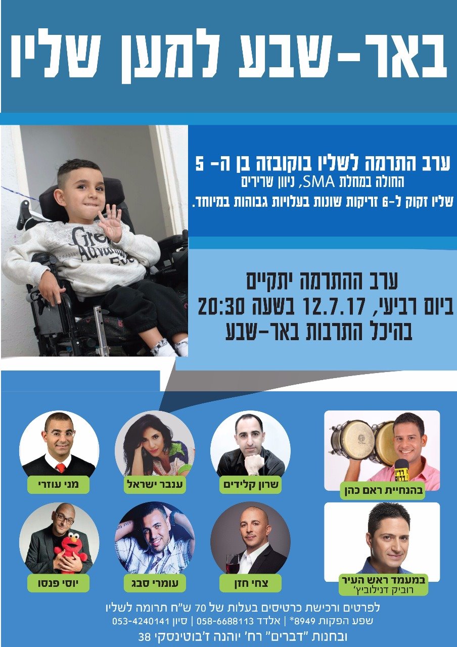 כבר למעלה מחצי שנה מנסה משפחתו של שליו בוקובזה, ילד בן 5 הסובל ממחלת ניוון שרירים, לגייס תרומות לטובת מתן טיפול רפואי לבנם. לשם מטרה חשובה זו, התגייסו מיטב האמנים בארץ למופע התרמה חגיגי, שיערך בתחילת החודש הבא!