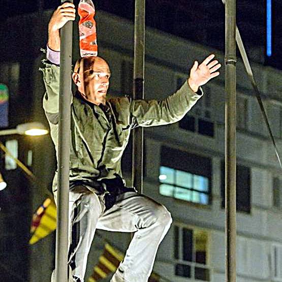 שלושה עמודים סיניים בגובה 5.5 מטר, כיסא, שולחן, שטיח, עיתון, וכוס מים -  אקרובטיקה במיטבה.
